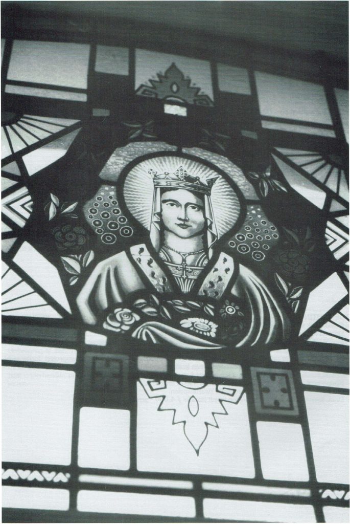 In het tochtportaal aan de zijde van de Molenstraat is het glas-in-loodraam met de afbeelding van de heilige Clara behouden gebleven.